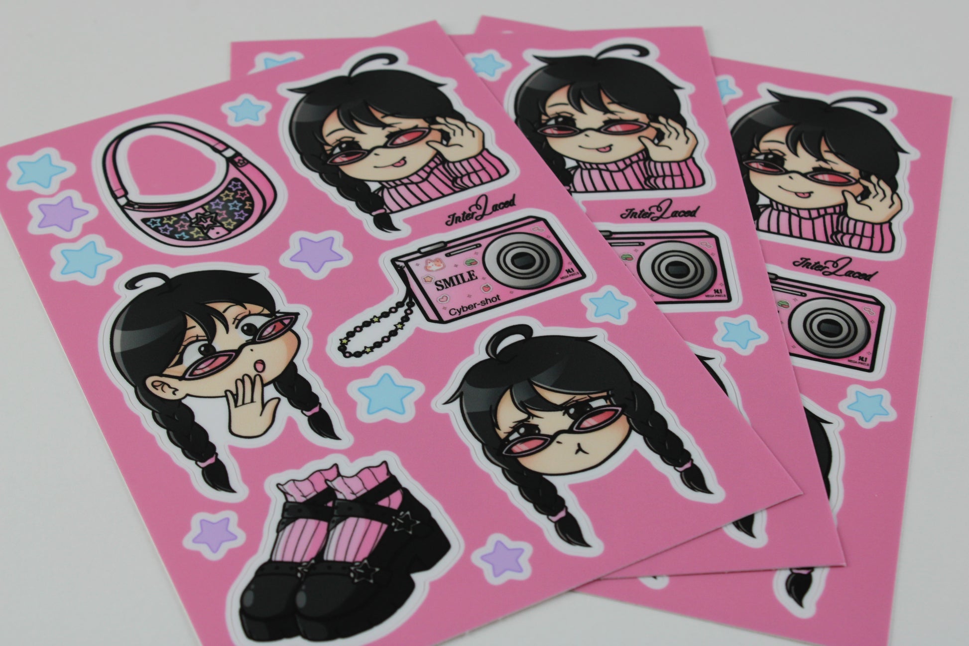 This product is a sticker sheet created with the idea of popular fashion that leans more towards Y2K. They are original drawings of a girl in an anime like style and her different emotions as well as some star stickers.