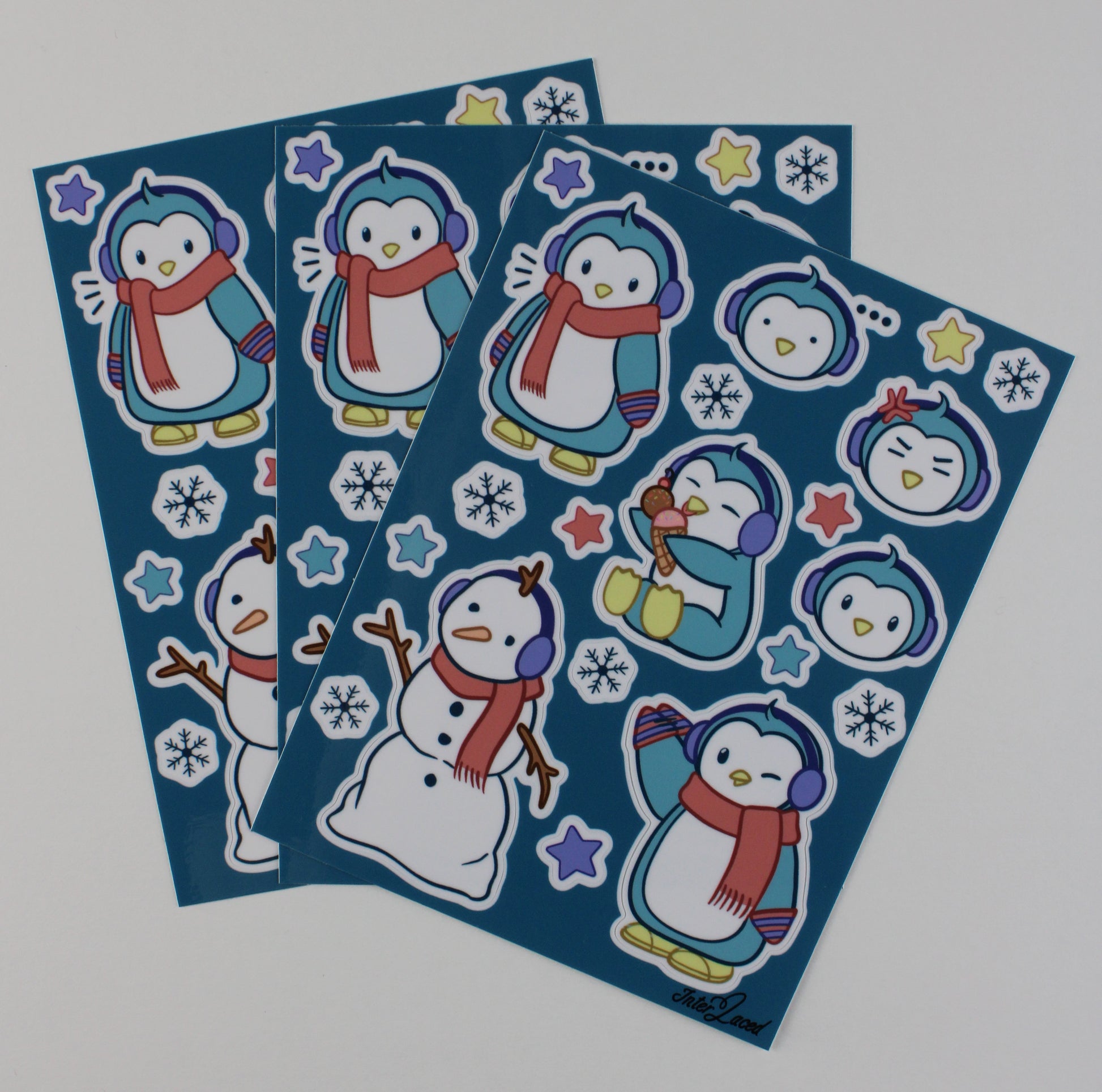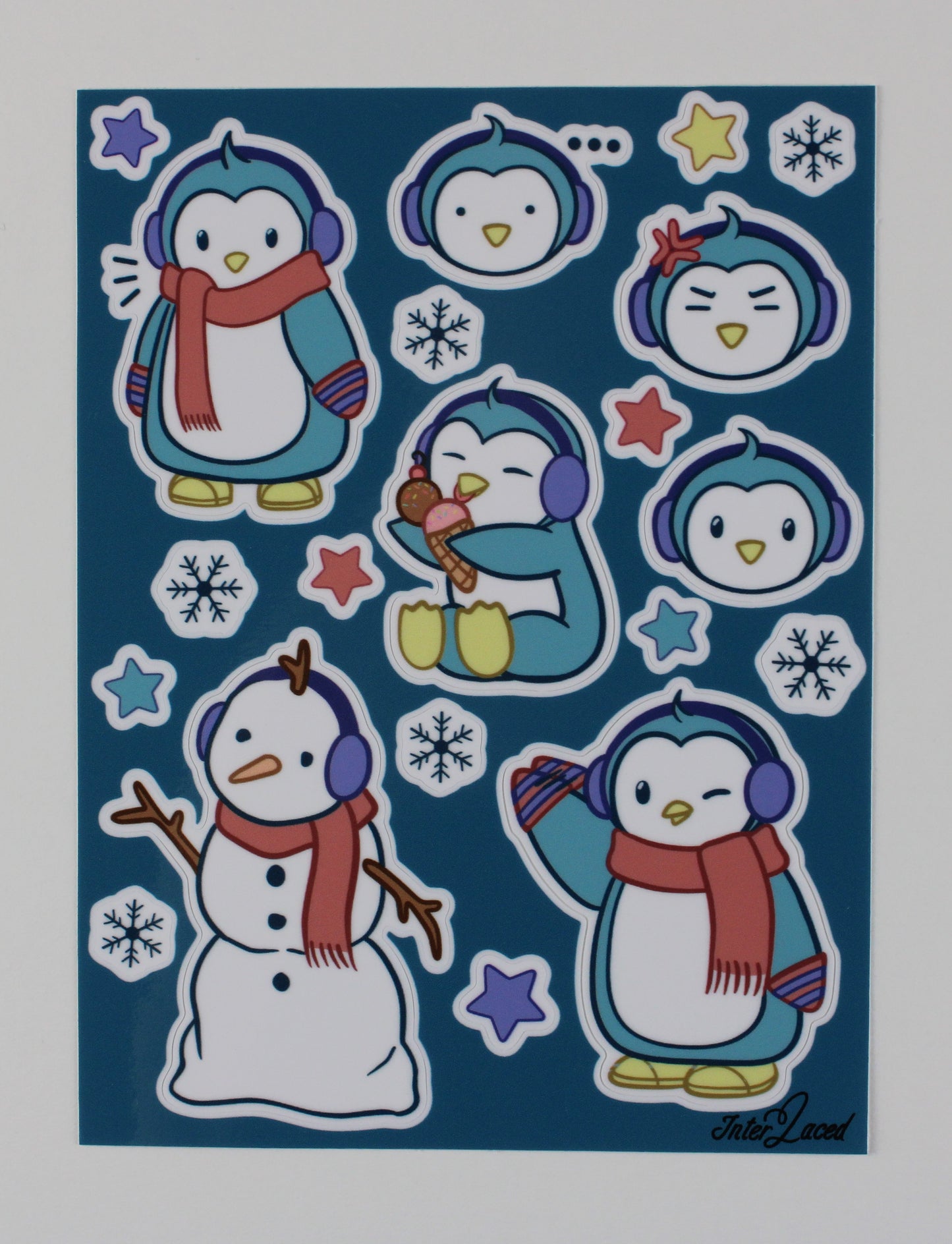 This product is a sticker sheet full of silly original drawings of a penguin named Tapi along with snowflakes and stars.